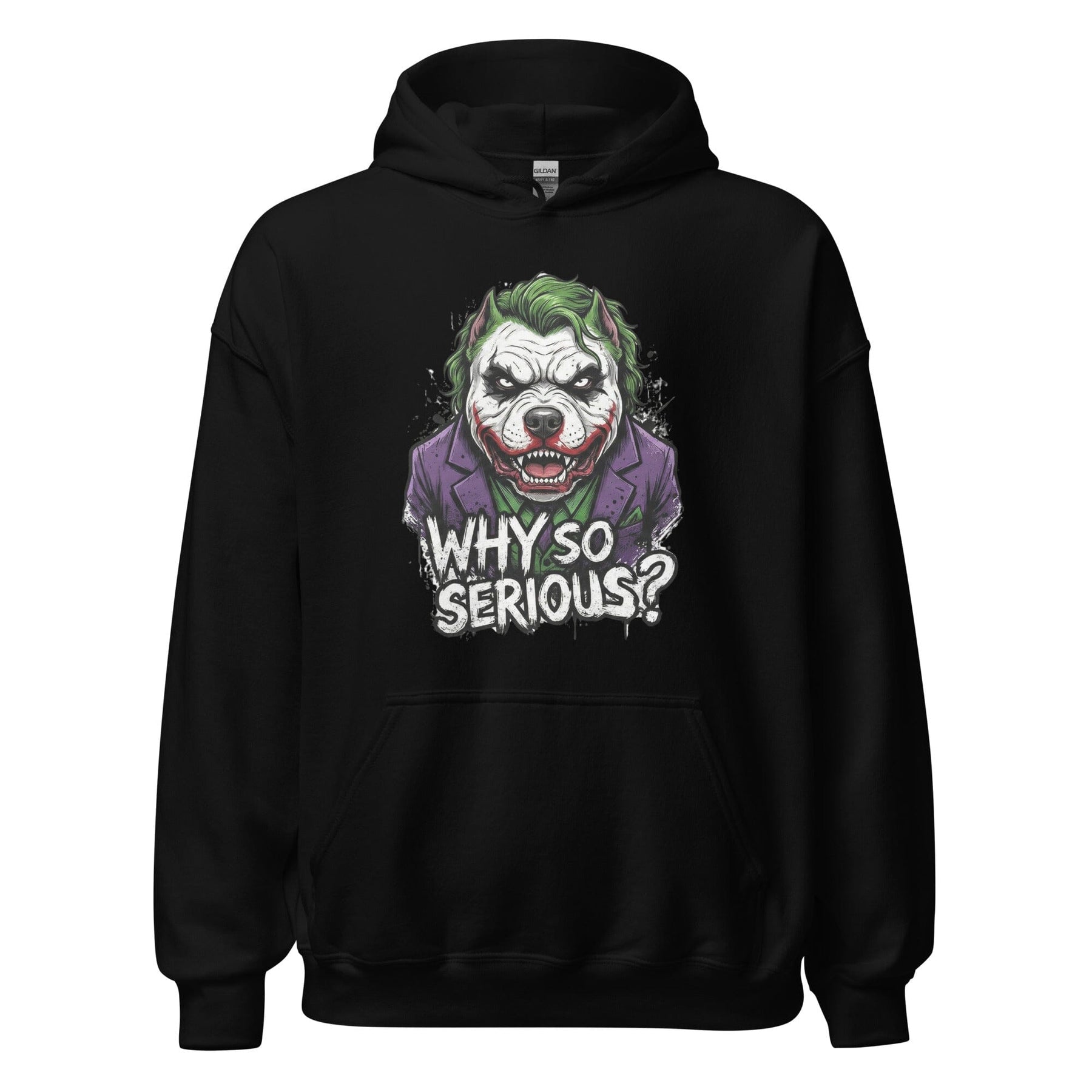 Dive into the thrilling world of Gotham with our black hoodie, inspired by the iconic Joker from the Batman series. At its center is a menacing depiction of a French Bulldog, capturing the Joker's infamous eerie allure, accompanied by the chilling question, "Why So Serious?" beneath it. A true homage to one of cinema's most intriguing characters.